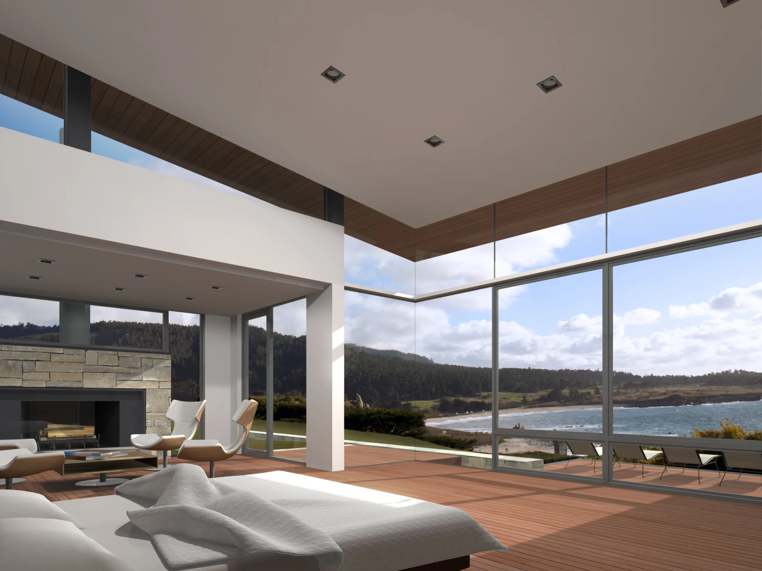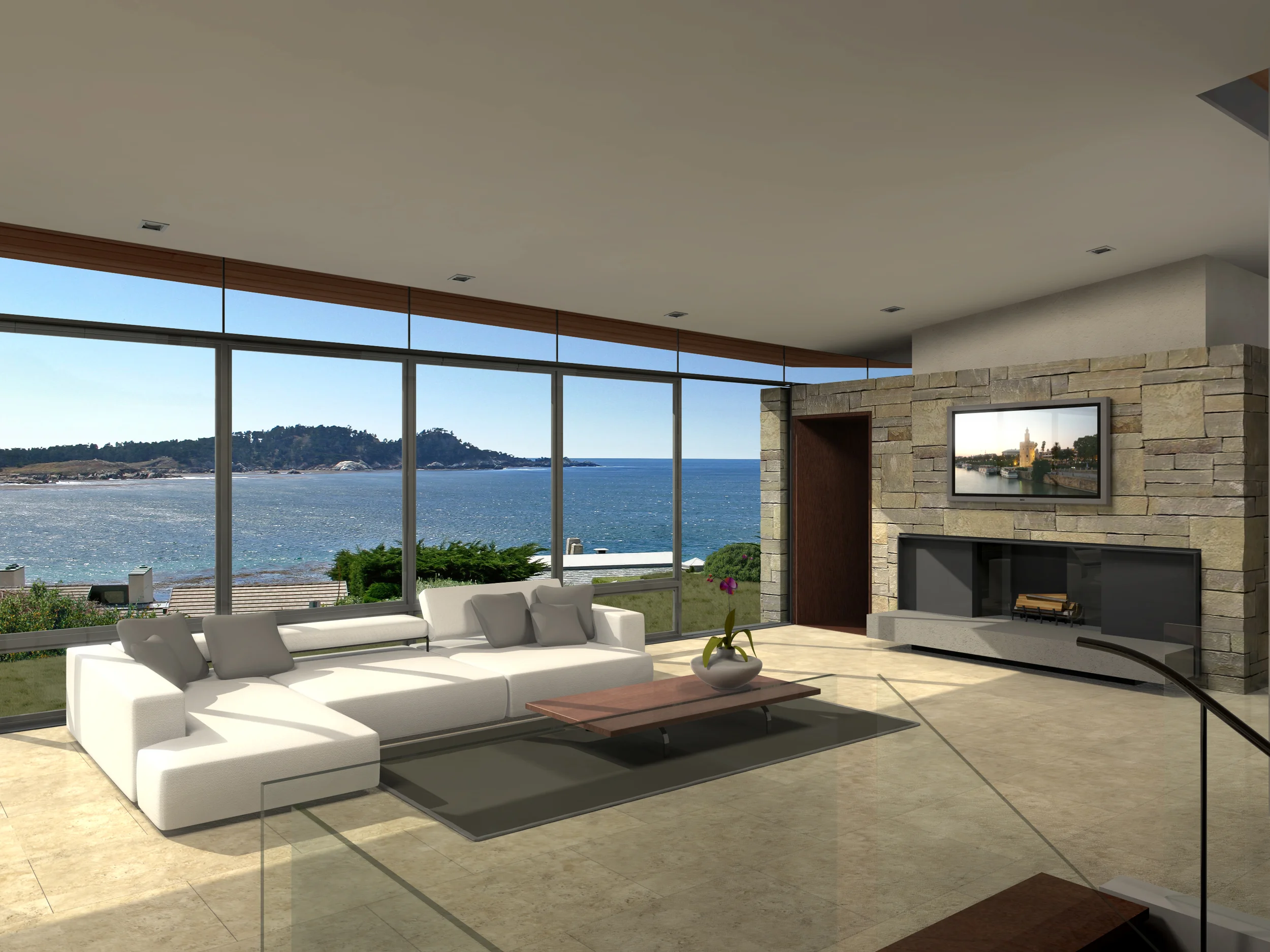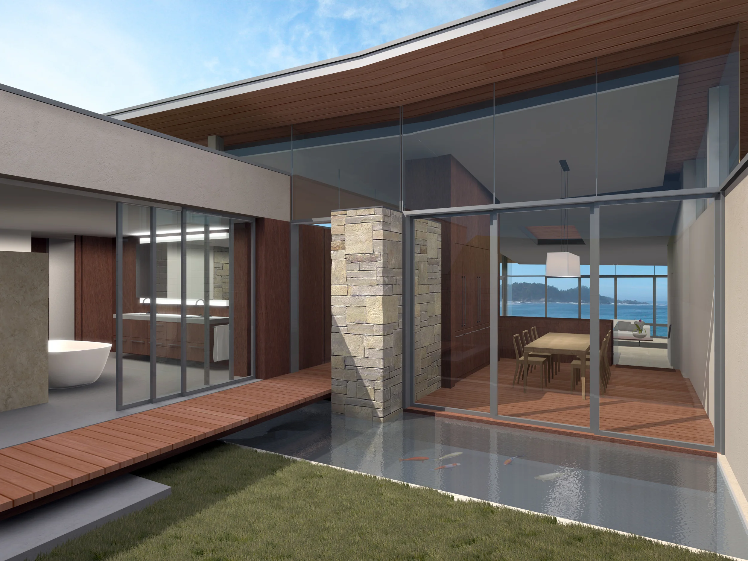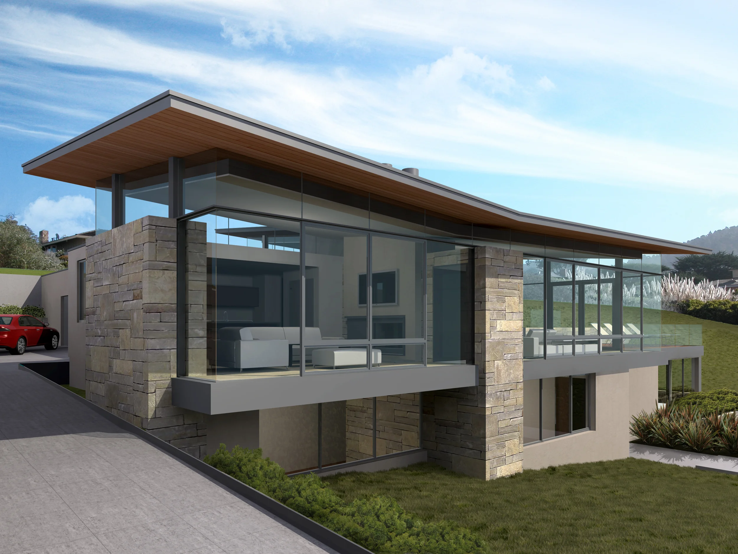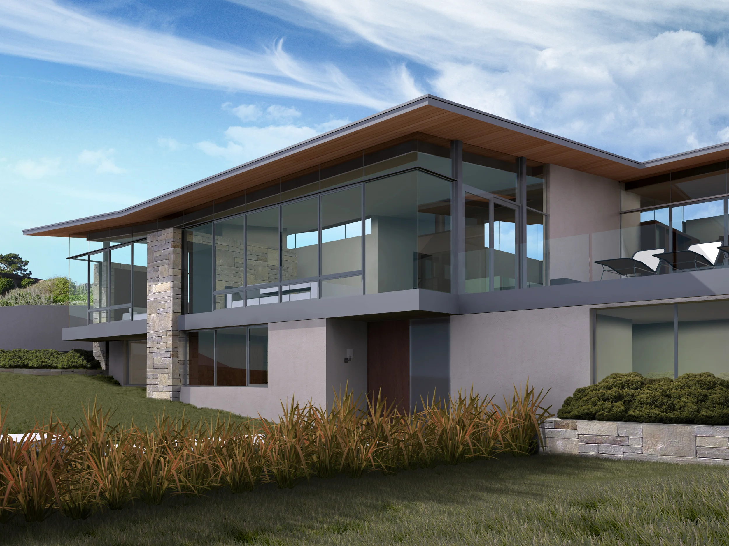 Located in a 1960s development south of Carmel, this speculative house with dramatic ocean views responds to strict height restrictions with structural bravado, creating "floating," dual-sloping butterfly roofs and surprising outdoor rooms to counteract deep excavations and extensive below-grade spaces.